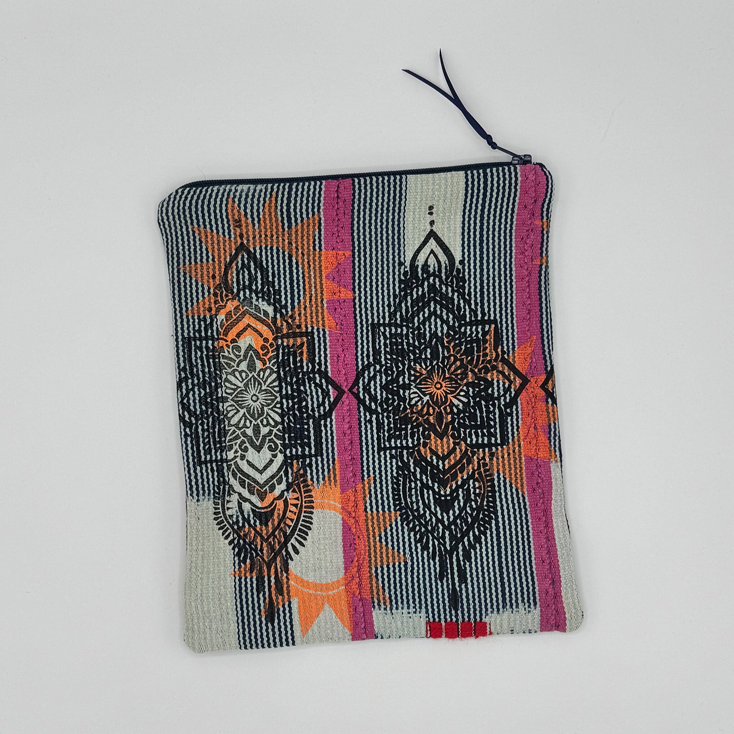 Hand-printed zipper pouches made with Moroccan textiles. Produced in limited quantities, each pouch carries subtle variation and the marks of the hand.