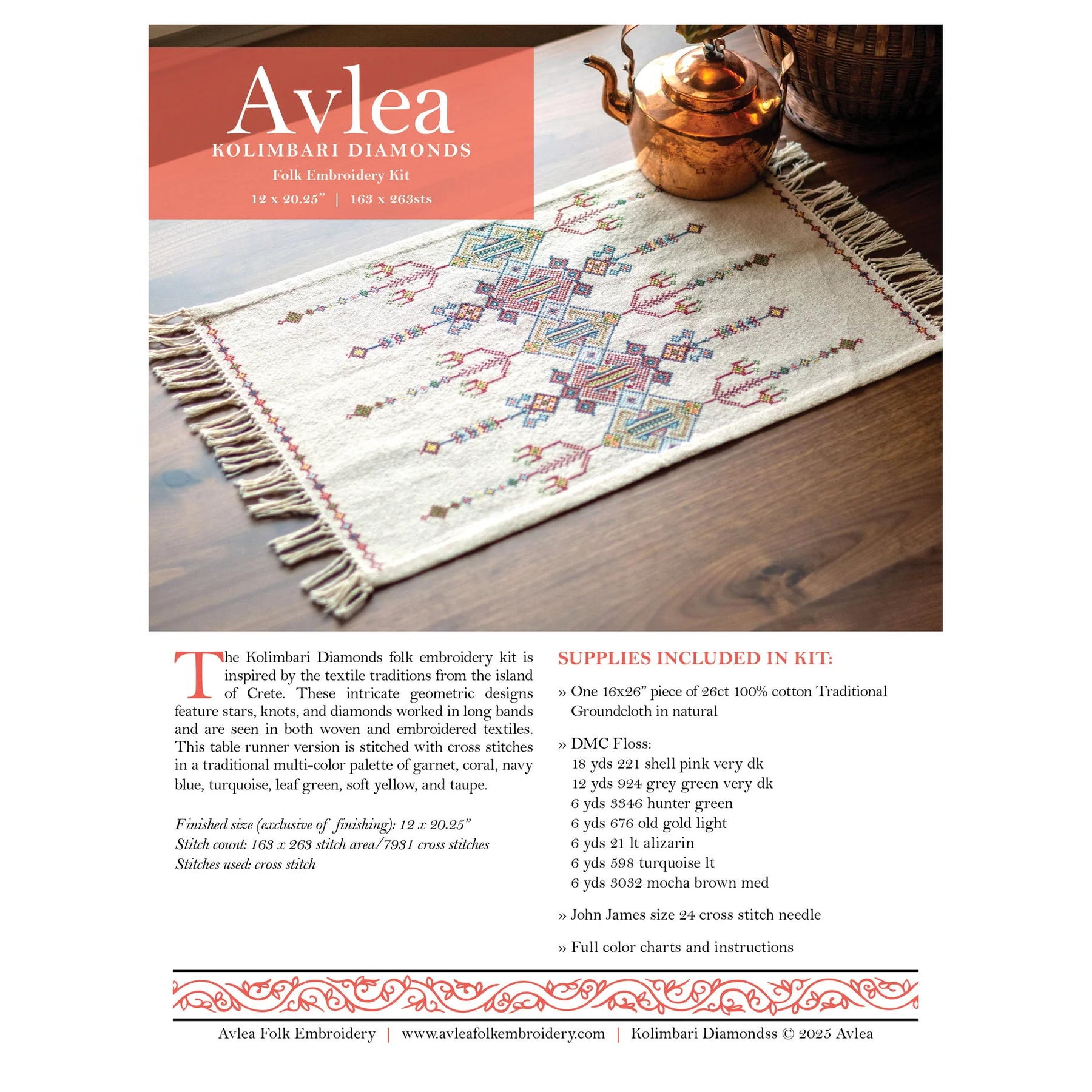 The Kolimbari Diamonds folk embroidery kit is inspired by the textile traditions from the island of Crete. The kit features intricate geometric designs feature stars, knots, and diamonds worked in long bands and are seen in both woven and embroidered textiles. This table runner version is stitched with cross stitches in a traditional multi-color palette of garnet, coral, navy blue, turquoise, leaf green, soft yellow, and taupe.