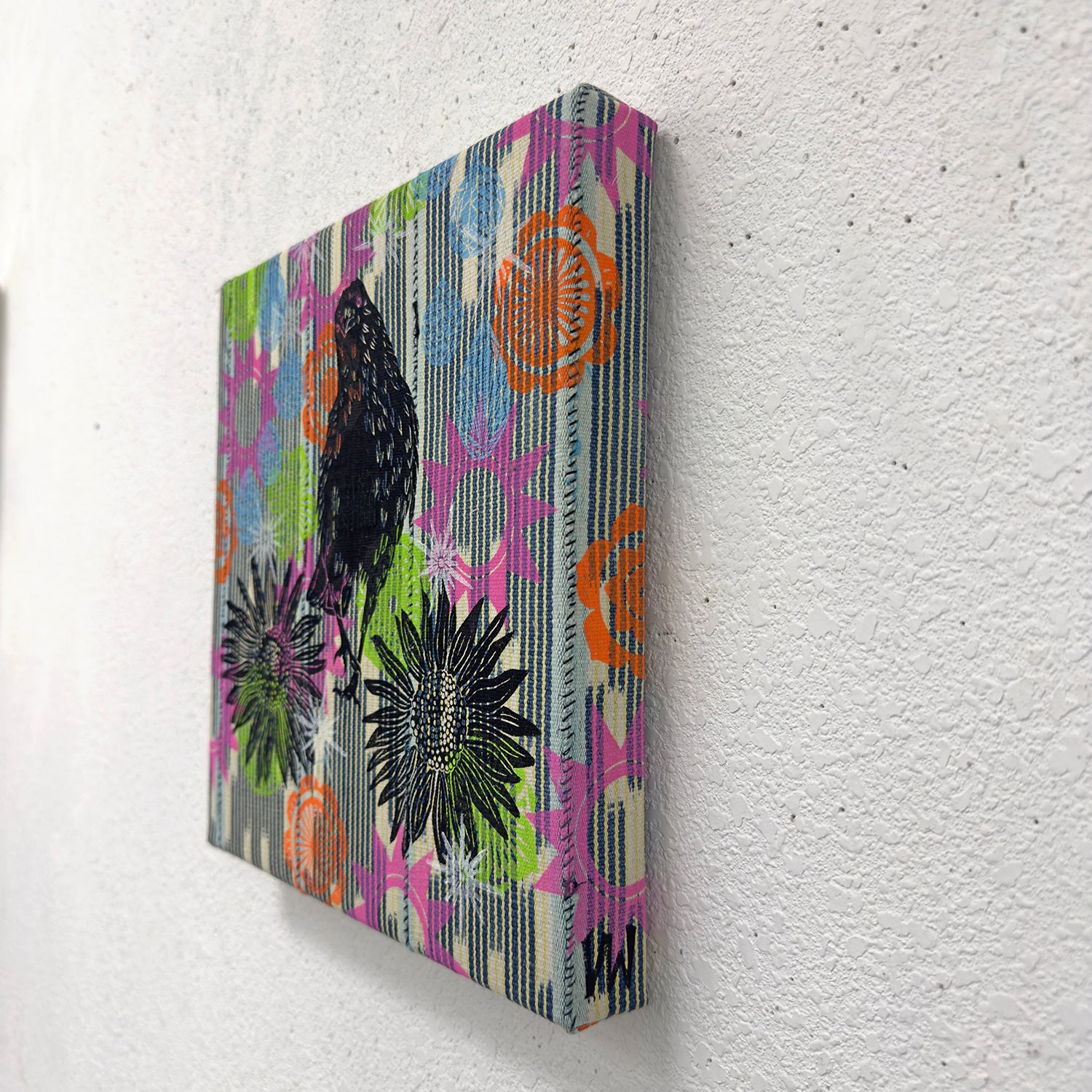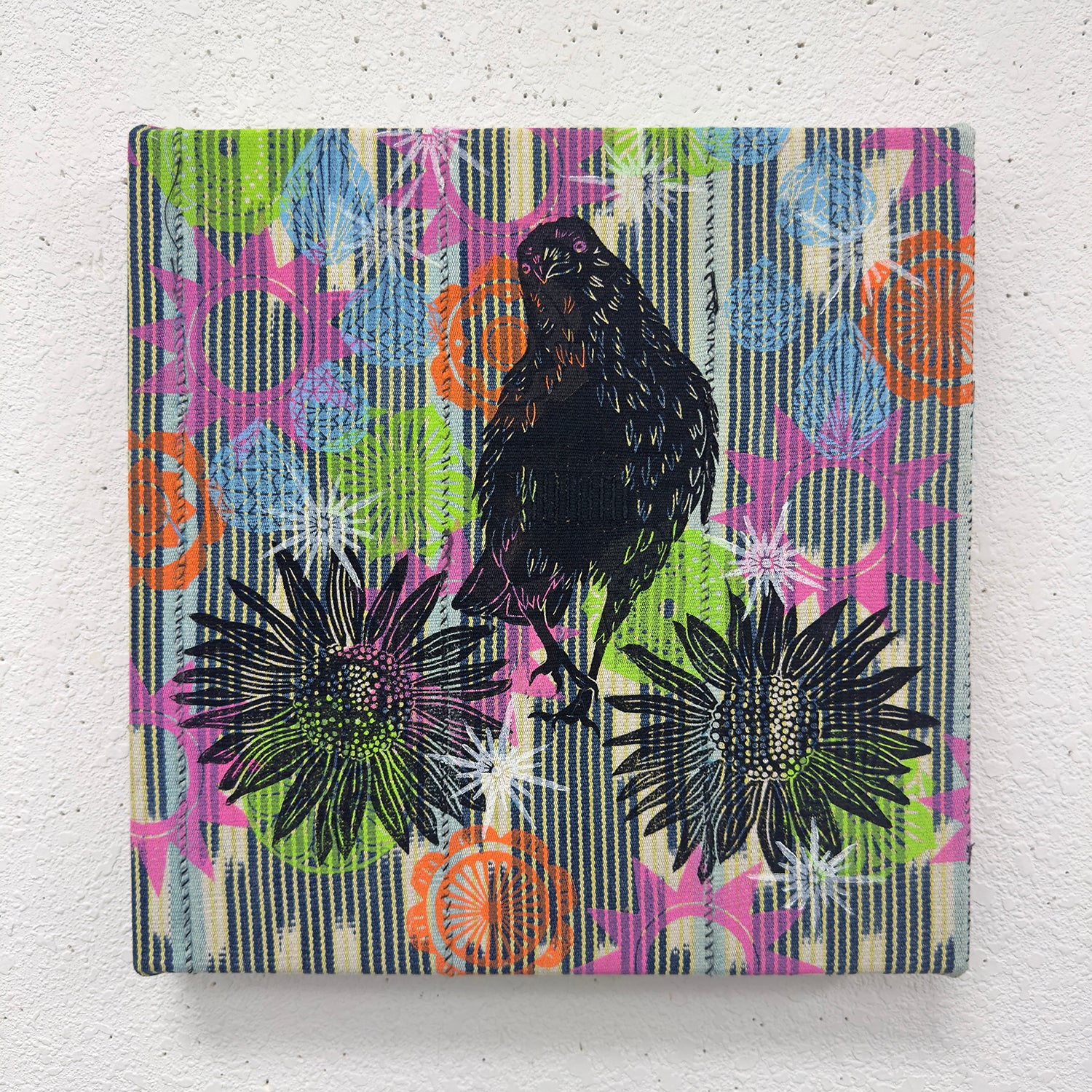 Grounded in Cloth is a series of one-of-a-kind works, hand-printed with crows on Moroccan textiles. Though the crow is repeated, each piece is singular—shaped by material, variation, and the marks of the hand.