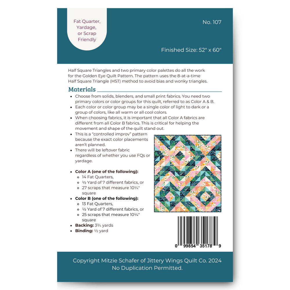 This pattern consists of half Square Triangles and two primary color palettes. The pattern uses the 8-at-a-time Half Square Triangle (HST) method to avoid bias and wonky triangles.