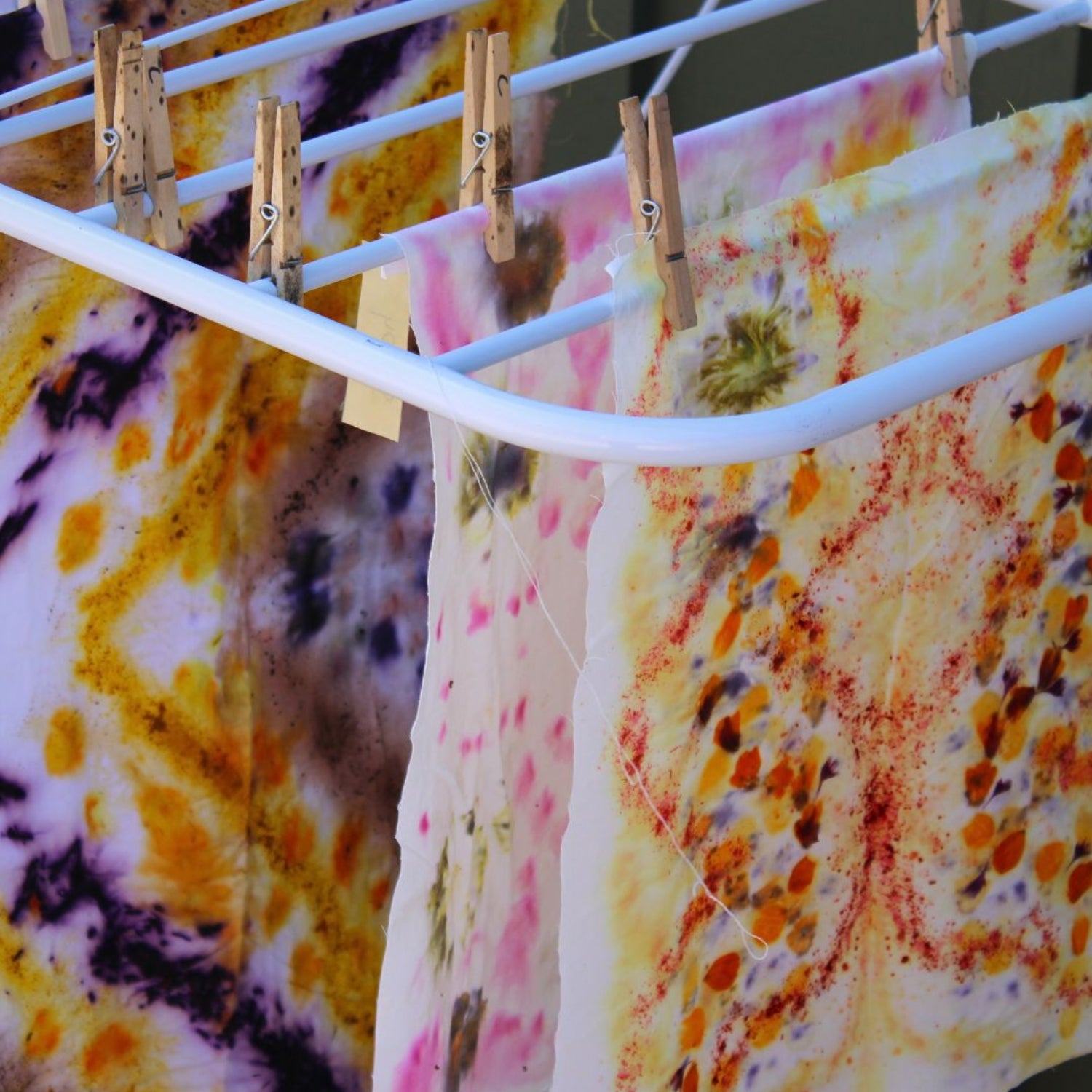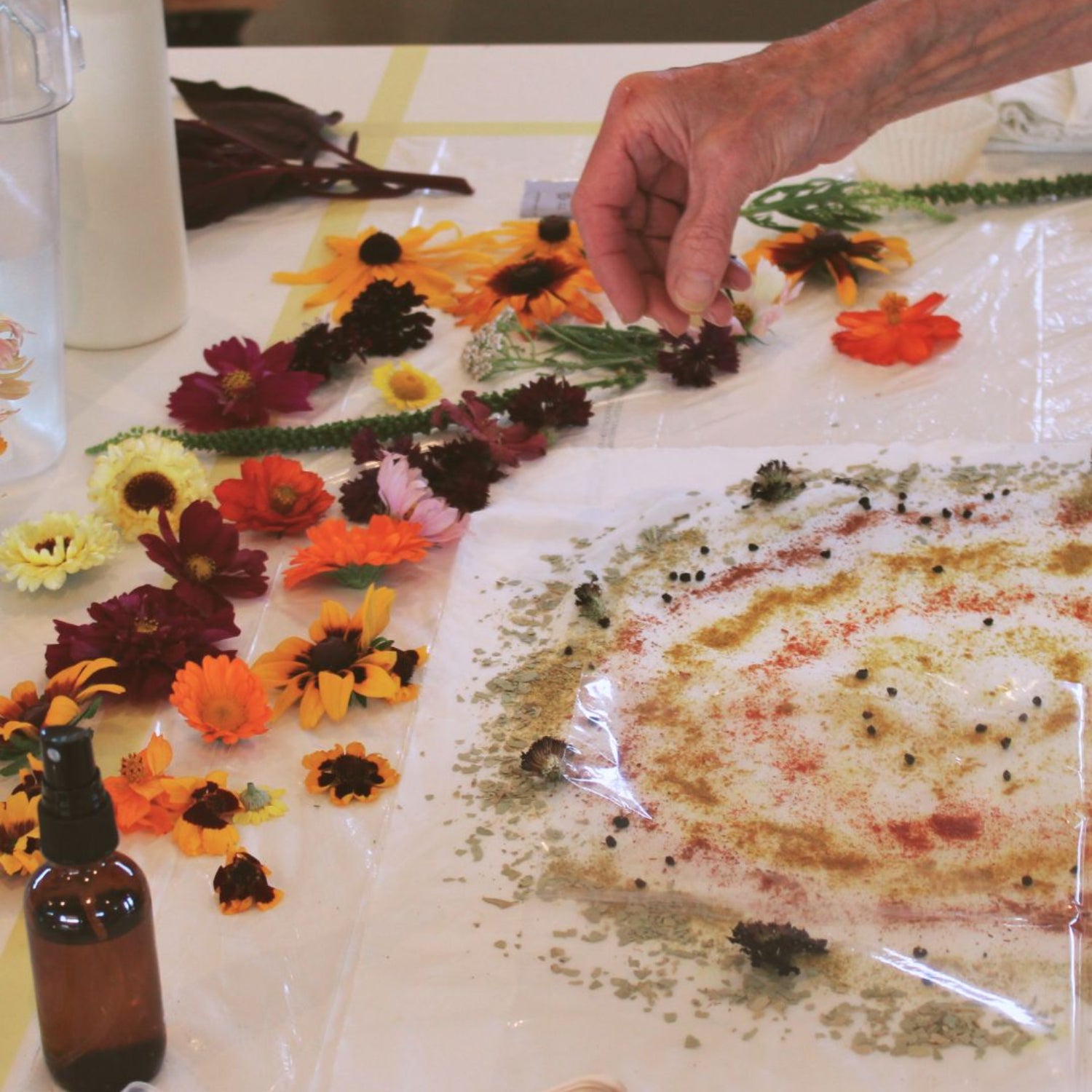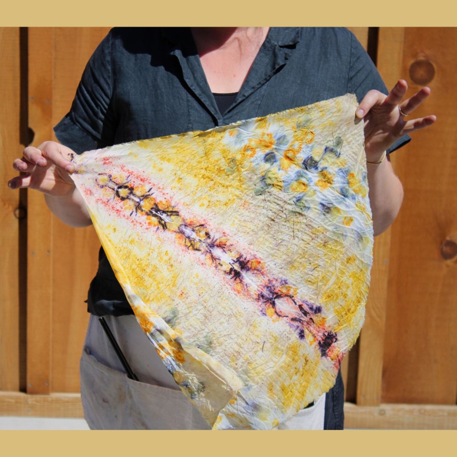 This workshop introduces the fundamentals of bundle dyeing and eco printing on fabric. During the workshop, students will gain knowledge about these processes and experiment with each method on sample fabrics before diving into a final project: a tote bag and silk scarf. This workshop utilizes plants grown and harvested at Pine Meadow Ranch specifically for their color and use in the natural dyeing processes.