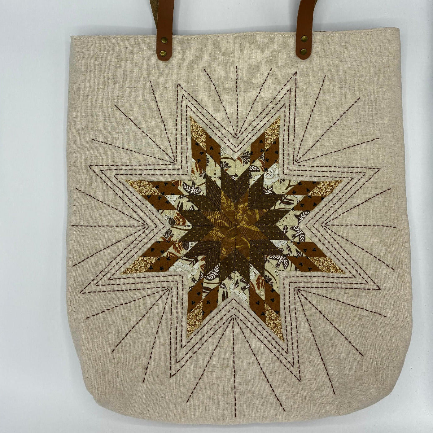 The centerpiece of the bag is a hand-stitched Lone Star. The bag is hand quilted.