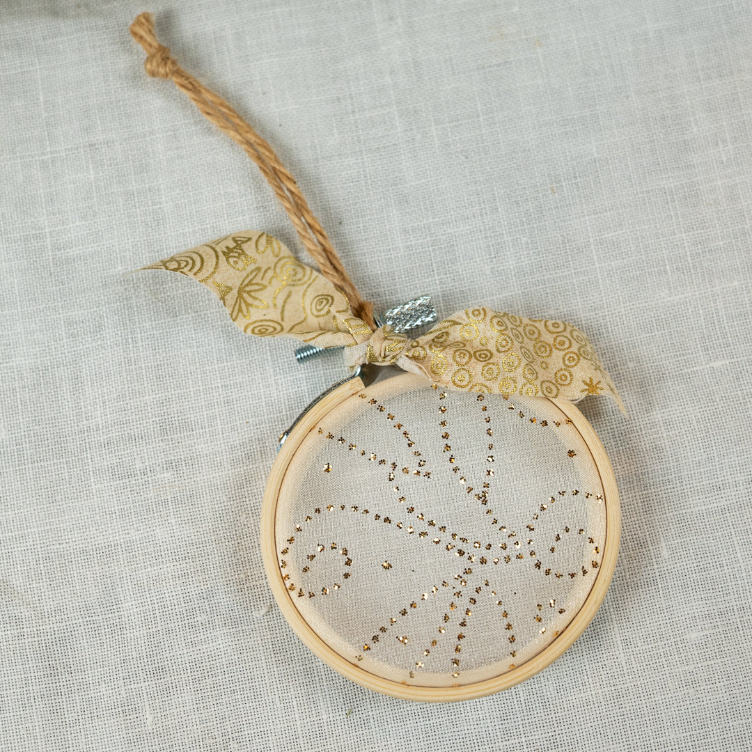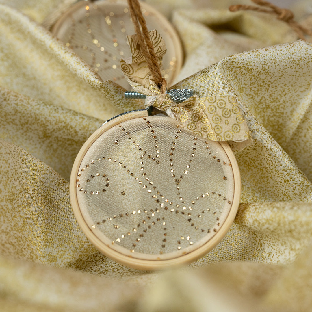 Bring a touch of golden sparkle to your holiday décor with our Golden Whispers hoop ornament. This 2.5" design features sheer fabric with delicate gold swirls, framed in a natural wooden hoop and finished with jute twine and a soft gold bow. Handmade in very limited quantities, it adds a warm, whimsical shimmer to any Christmas tree.