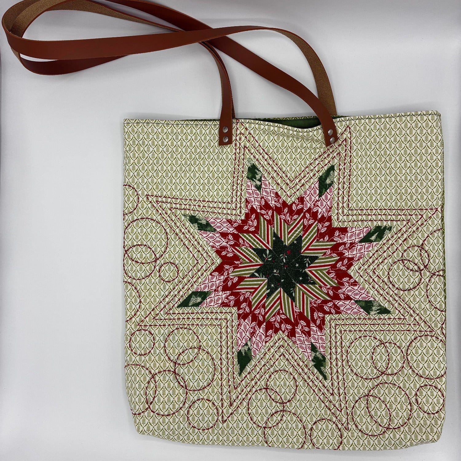 The centerpiece of the bag is a hand-stitched Lone Star. The bag is hand quilted.
