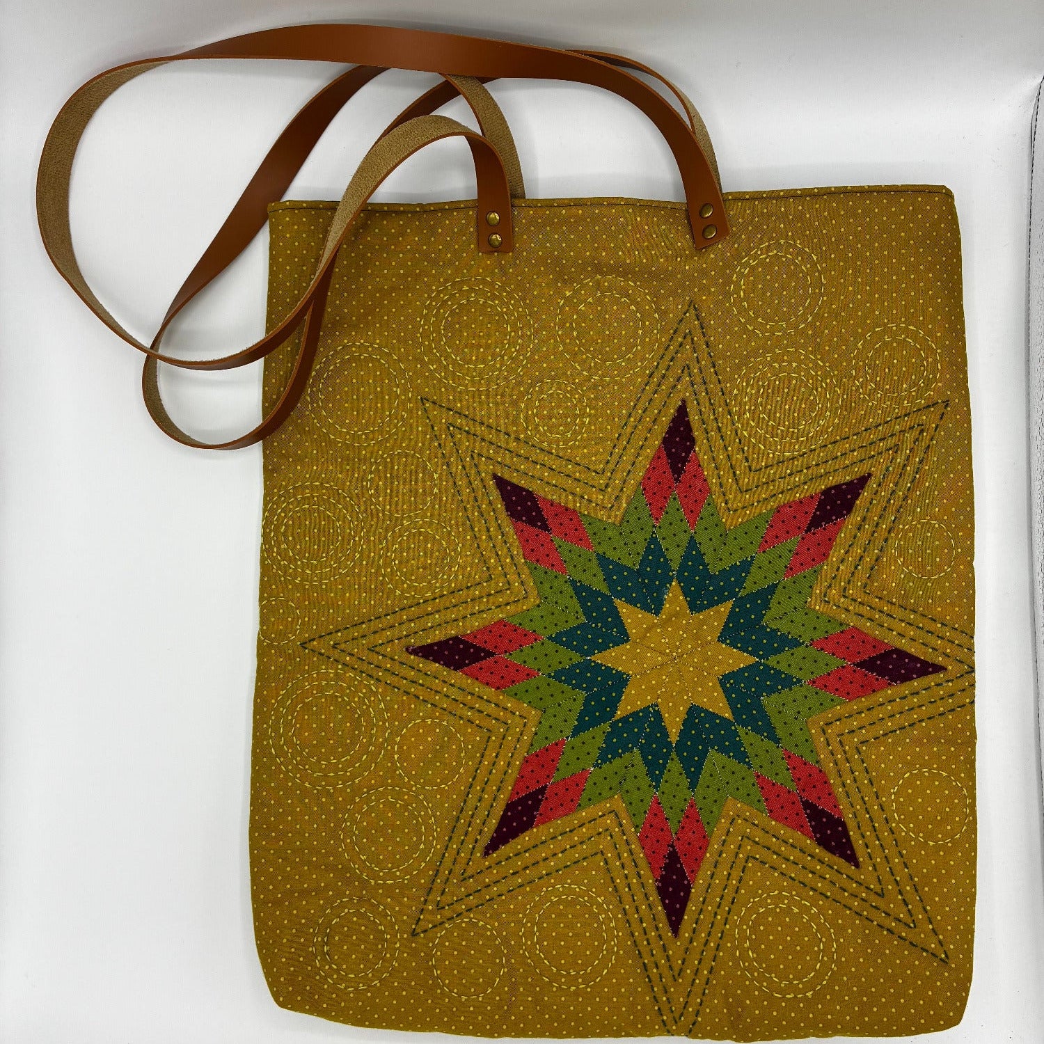 The centerpiece of the bag is a hand-stitched Lone Star. The bag is hand quilted.
