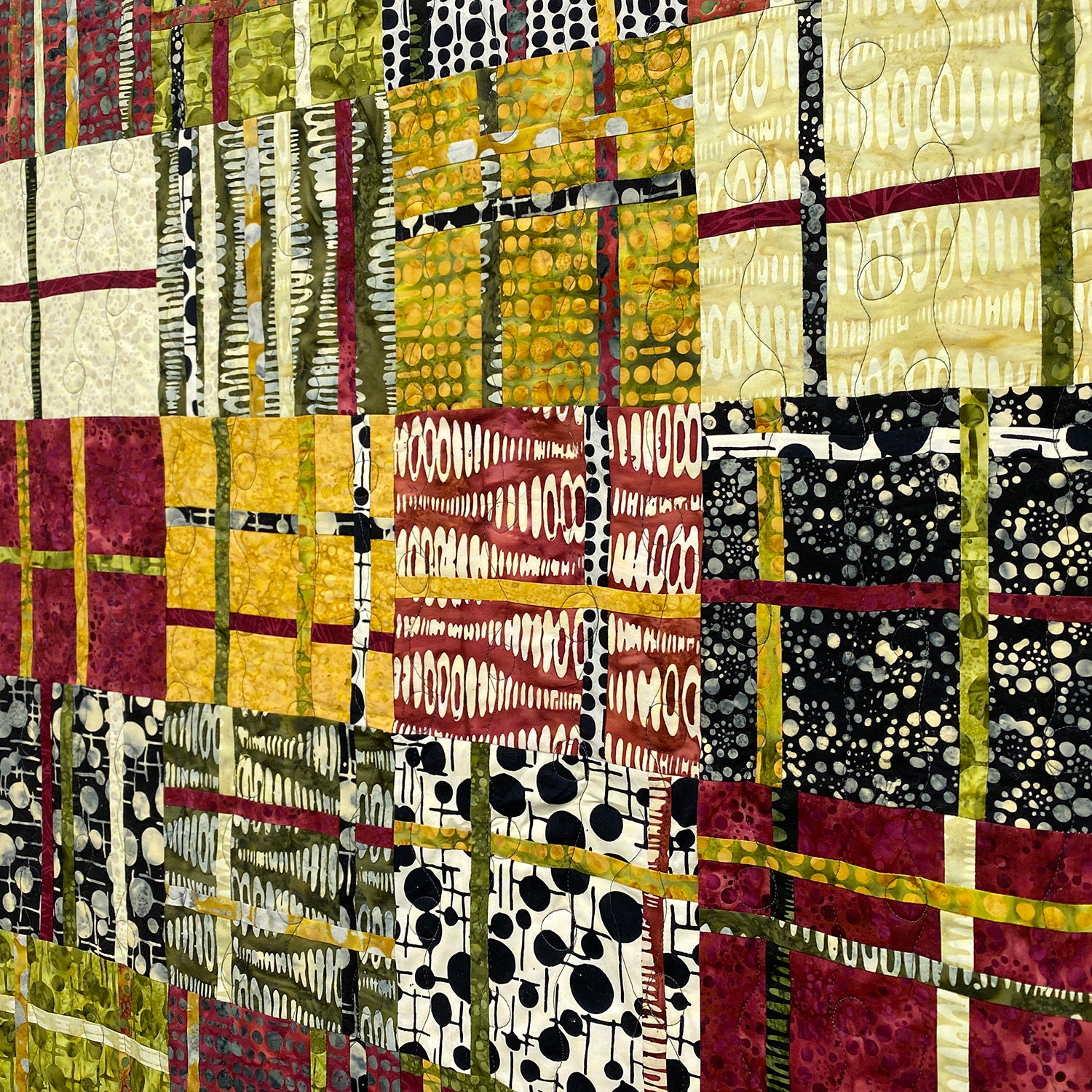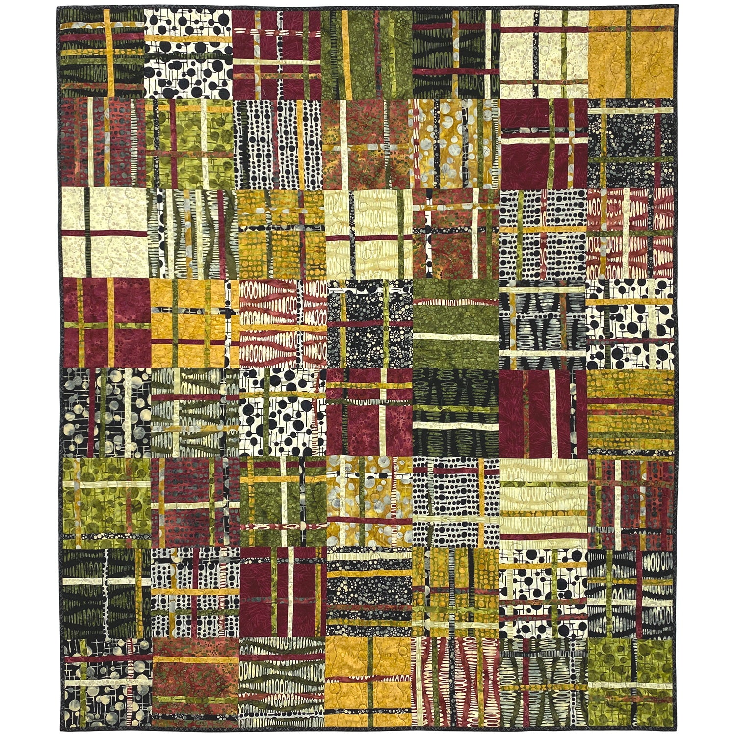 We've taken one of our favorite patterns, Cranberry Chutney by Kenna Ogg, and paired it with some wonderful fabrics from Banyan Batiks. The straight lines in the pattern create a good counterpoint to the curved shapes of the circles, waves, and bubbles in the fabric. The colors are dark and rich, giving a warm, earthy feel to this lap sized quilt. The pattern is fairly straightforward, and there are no bias edges, making this quilt suitable for confident beginners and experienced quilters alike. Add a bit of spice to your home with our Cranberry Chutney quilt kit!