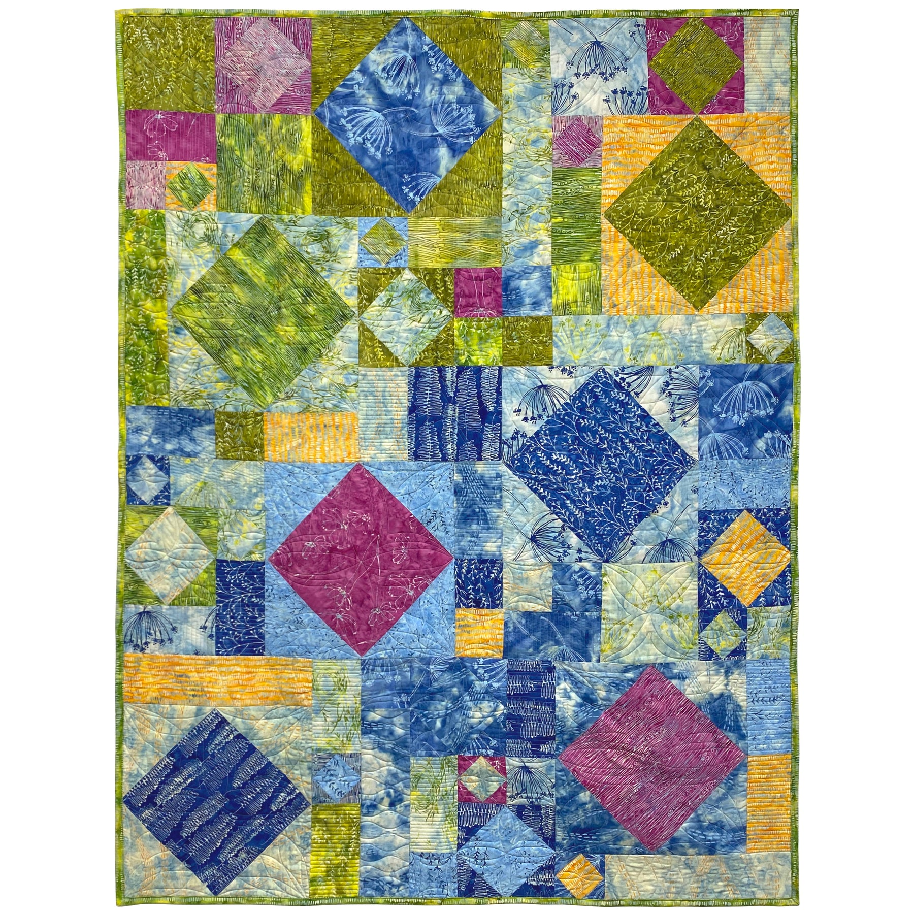 Sam Hunter's "Fourteen On Point" is one of her line of quilt patterns designed to use pre-cuts. It's fast to make , uses only 14 fat quarters, and you can usually make the top in a day. The pattern uses easy to assemble squares, triangles and rectangles for an improvisational look with very little waste or hassle. It's easier than it looks! We've paired it up with Jean Wells beautiful "Meadow Brook" batiks. They feature nature-inspired motifs in the soothing colors of a meadow with a blue brook, and pops of bright colors from wildflowers.