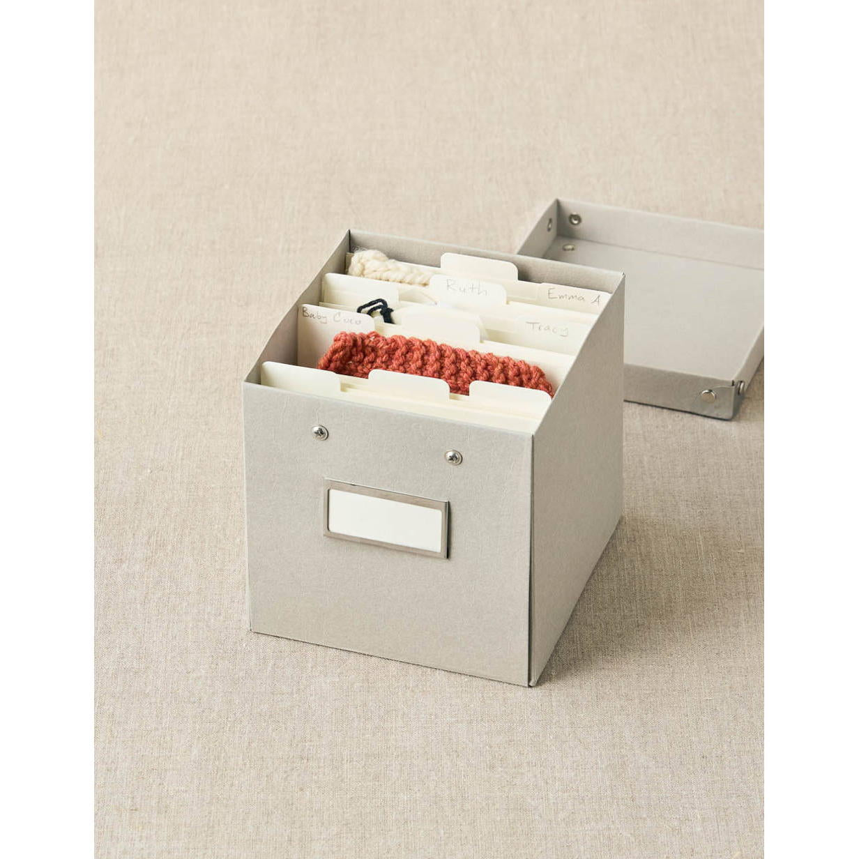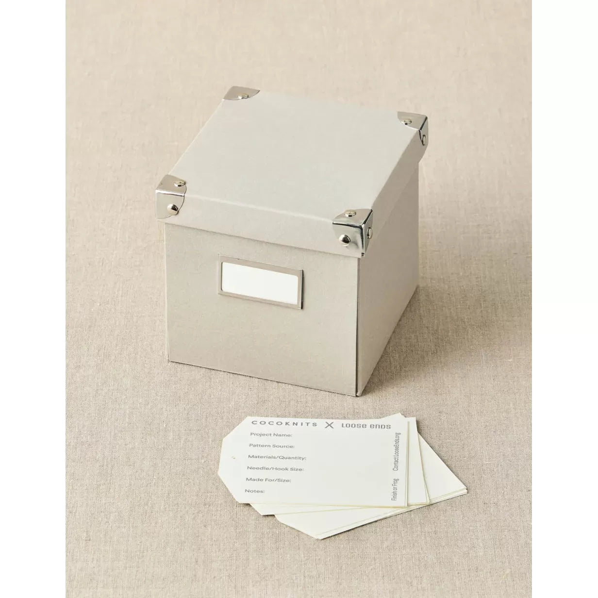 The project keeper uses the folders and tags to keep all the details of any project organized in this retro style box. Knitting, crochet, quilting, needlework, and more - record the tools, pattern, sizes, materials, recipient, and other important information. Keep the tag with the project for notes on the go, then file in the Project Keeper when complete. The folders can hold a swatch, yarn labels, fabric samples and other materials, along with the project tag.
