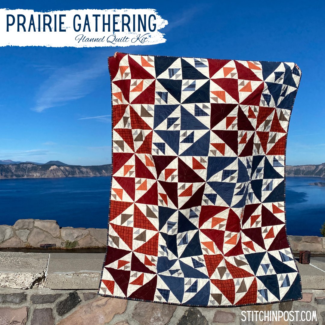 The Prairie Gathering Quilt Kit features a cozy lap-sized design with the Arrowhead pattern by Lisa Bonjean of Primitive Gatherings. Crafted from flannel in rustic plaids, stripes, and muted colors, this kit combines warmth and timeless style. Perfect for creating a comforting quilt that adds charm and softness to your home, it invites you to enjoy a relaxing and rewarding sewing experience.