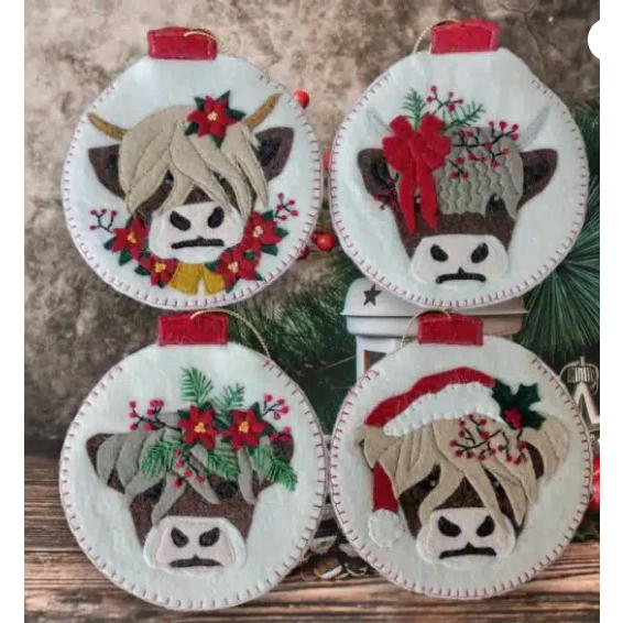 The Christmas Cows Ornaments Kit includes all wool felt, floss, and templates needed to complete 4 beautiful ornaments. Ornaments measure approximately 4”. Each ornament contains a Highlander cow head with various embroidered embellishments. The ornaments are made of modern holiday colors of green, red, white, black, and brown. The Ornament Kits are finished with open tops to be used as gift card holders.