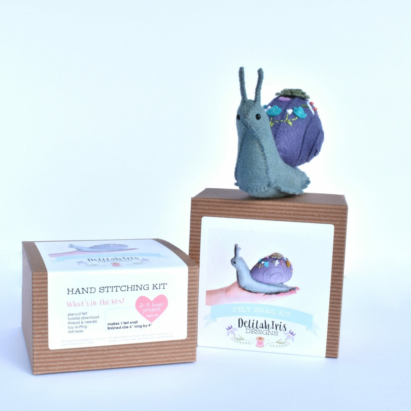 Each kit comes with pre-cut felt, sewing notions, and a digital tutorial to create a felt snail with a embroidered and felt flower adorned shell.