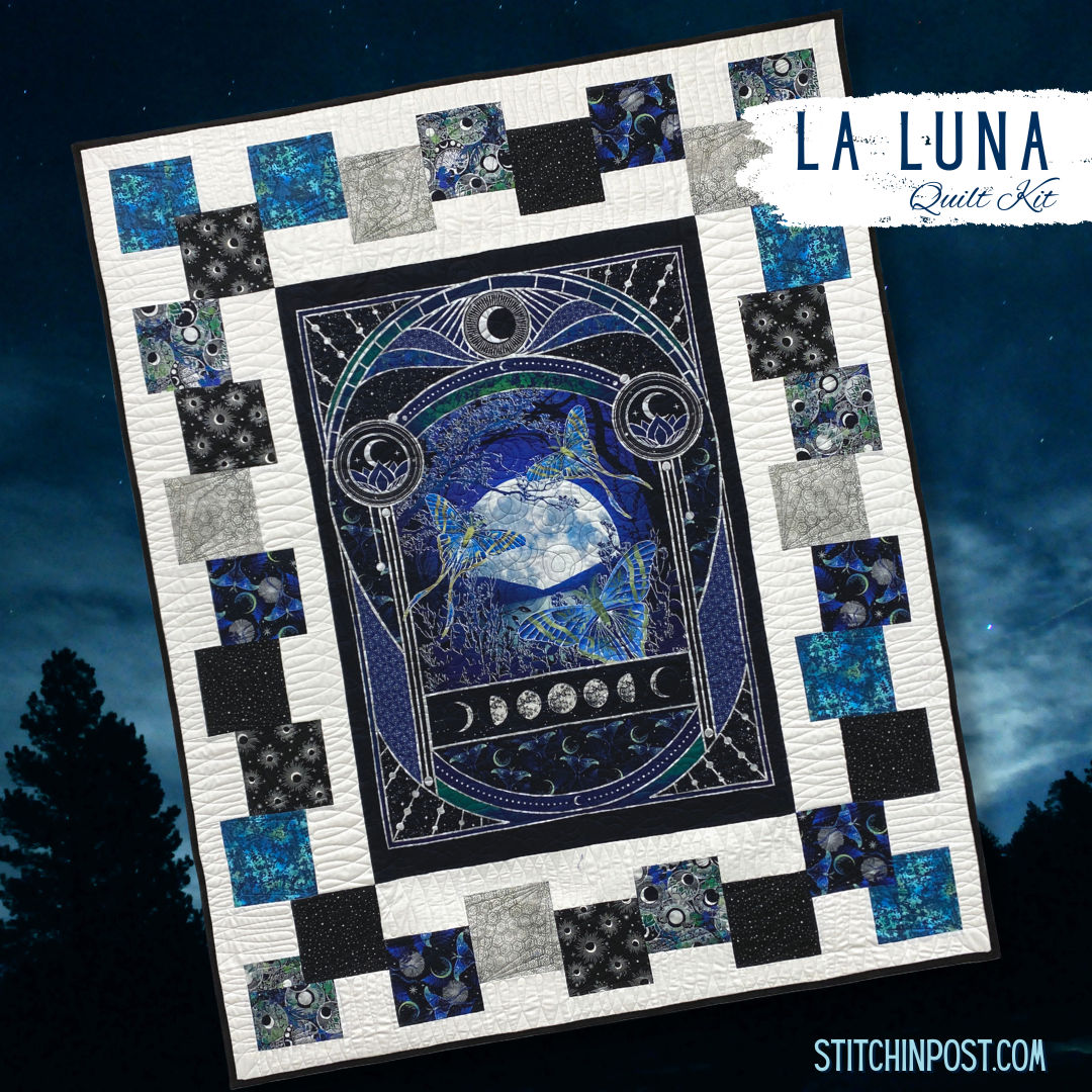 Bring the magic of the night sky into your home with the La Luna Quilt Kit, featuring stunning fabrics designed by Jason Yenter. This kit includes a gorgeous large center panel showcasing Luna moths, moons, stars, and celestial details rendered in deep blues, pale greens, and blacks, with shimmering metallic silver accents. The prints also feature beautiful ferns and foliage details that add natural elegance to the design. The Quilter's Palette pattern has a pieced white border adorned with inset squares of coordinating fabrics, creating a sophisticated frame to complement the focal panel. Perfect for quilters seeking a show-stopping project, this quilt combines celestial wonder with botanical beauty for a truly enchanting quilt.