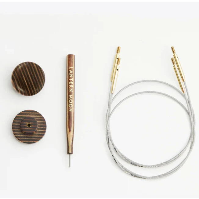 Lantern Moon Swivel Cords are made of nylon-coated stainless steel with 24K plated solid brass connectors. The cord rotates at the join for twist-free knitting and stays relaxed to prevent kinks. Each pack contains 2 cords, 2 wooden end caps and 1 tightening tool.