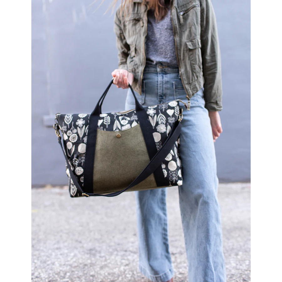 A versatile zippered top tote bag in two sizes to sew! Features an easy-access front pocket, reinforced base, crossbody strap, and a roomy interior with a slip pocket. Customize yours by quilting!